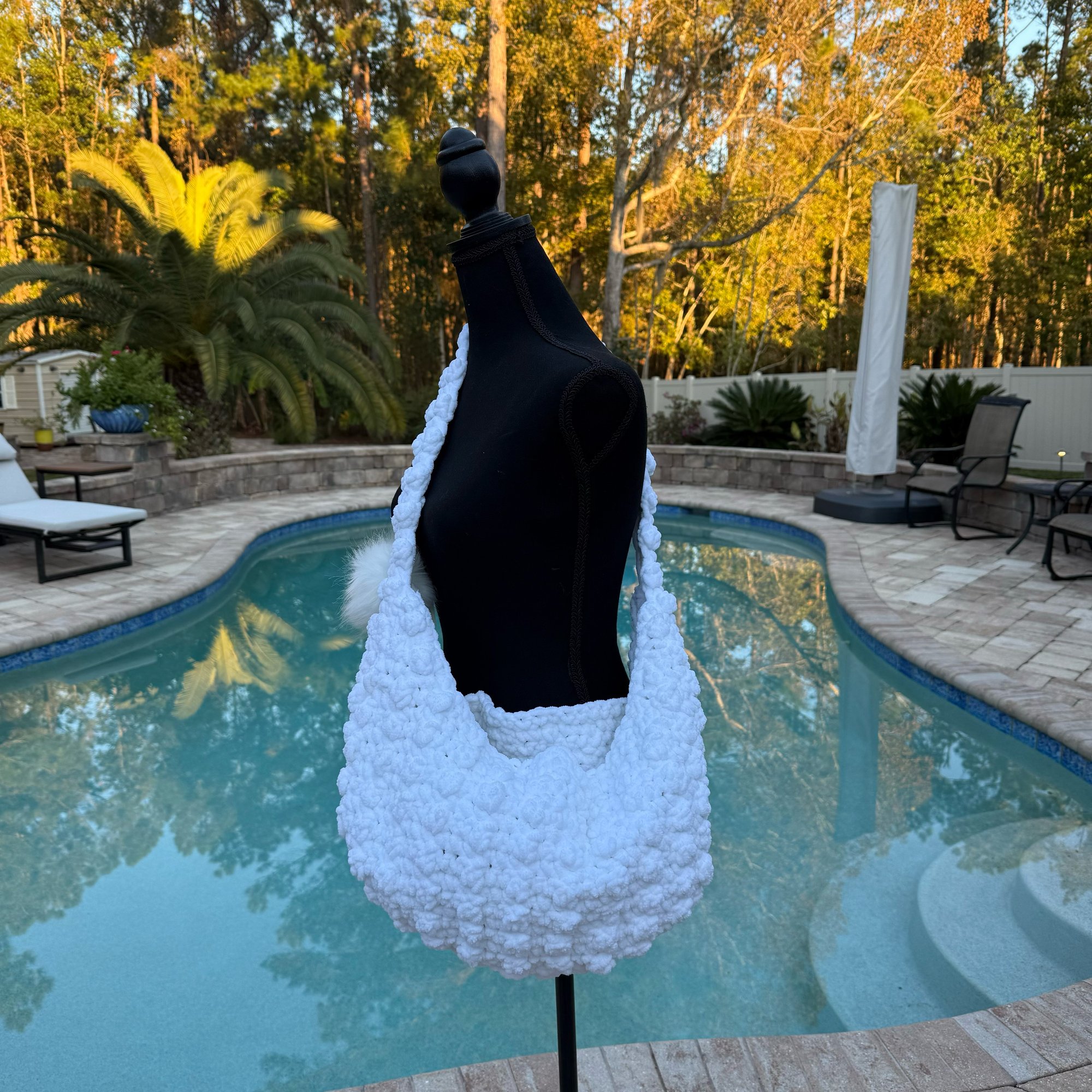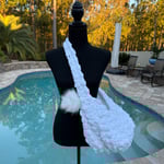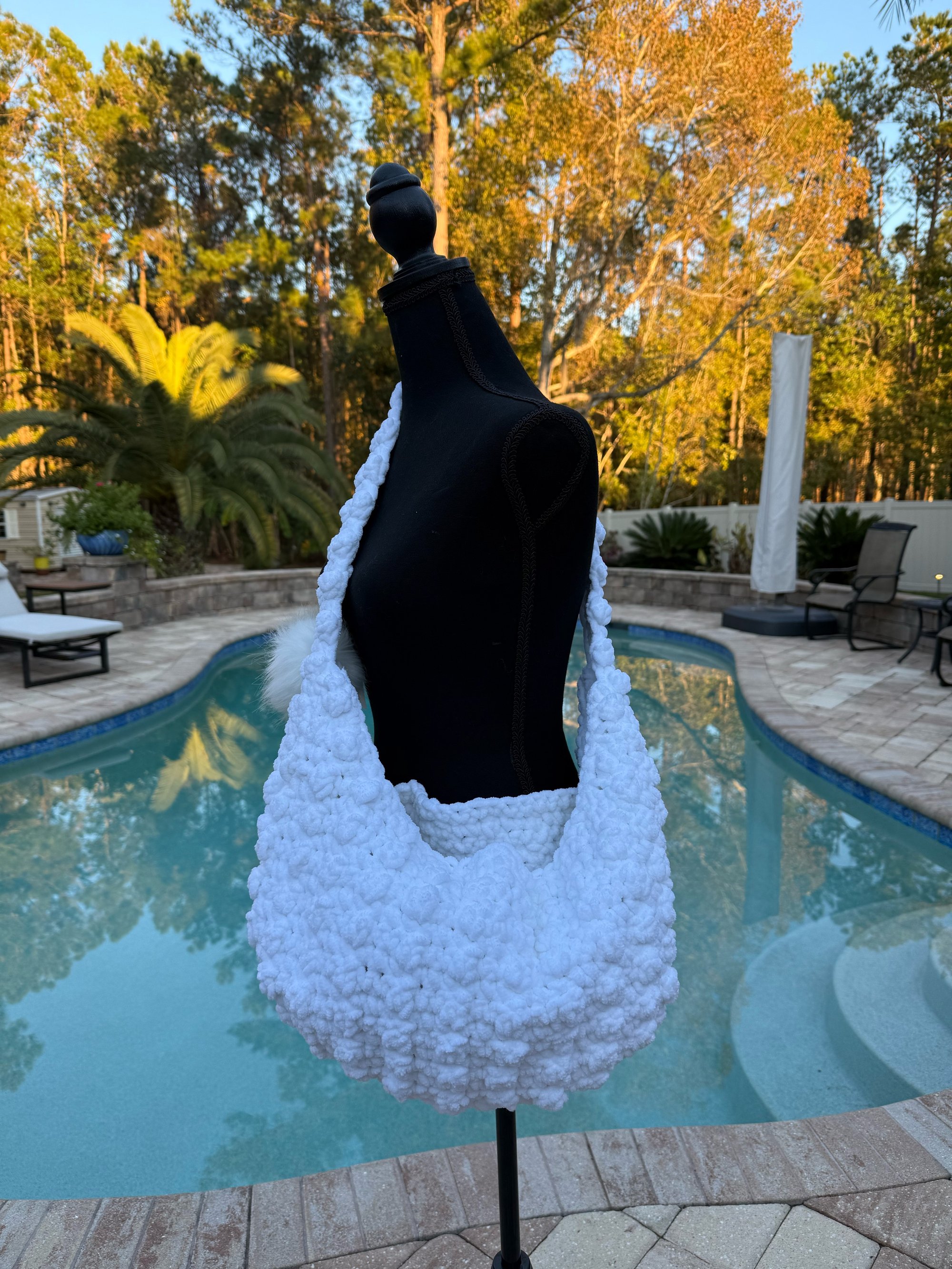 Introducing the Frosted Puff Bag, a luxurious accessory perfect for the winter season. This 100% handmade bag is made from soft, cozy fur yarn, providing a comfortable and warm feel to the bag. The bag comes with a charming fur ball detail, adding an extra touch of flair to the bag.