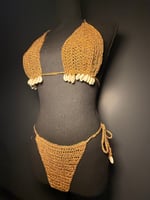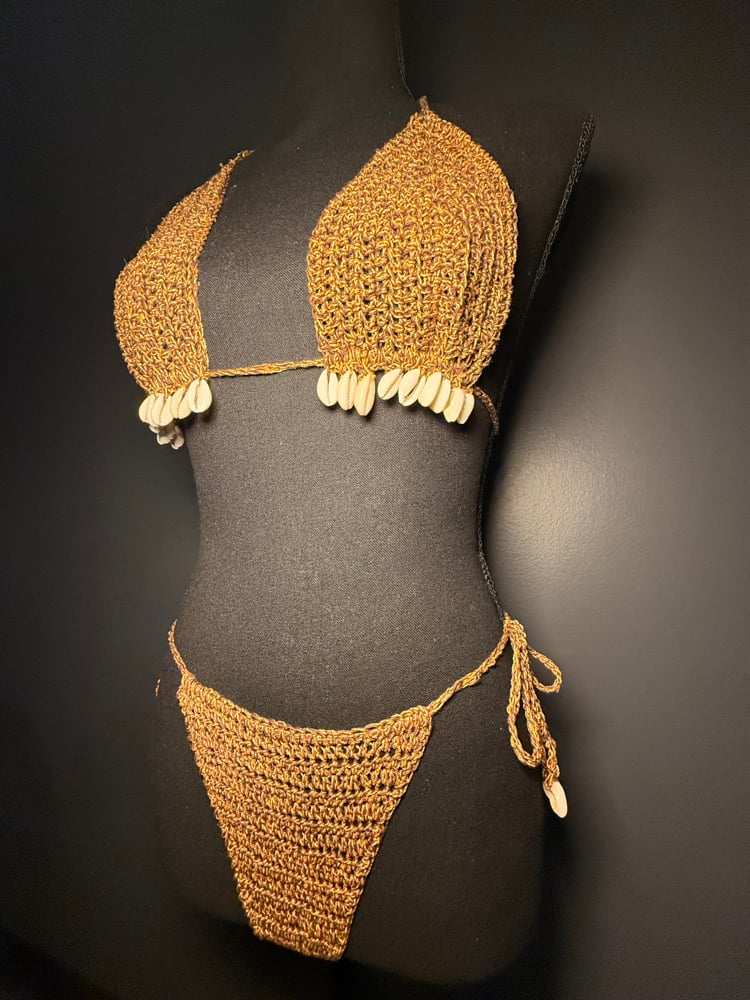 Unveil your inner sun goddess in the Golden Siren bikini — a rich blend of chocolate brown and gold designed to capture the magic of golden hour. Handmade with precision and intention, this two-piece crochet set features authentic sea shells delicately embedded along the neck ties, underbust, waist straps, and lower bra line — each one individually placed to honor your natural beauty. Fully lined with a soft nude layer, Golden Siren ensures both comfort and coverage while letting your confidence shine. Perfect for luxury lounging or sunset escapes, no two pieces are exactly the same.